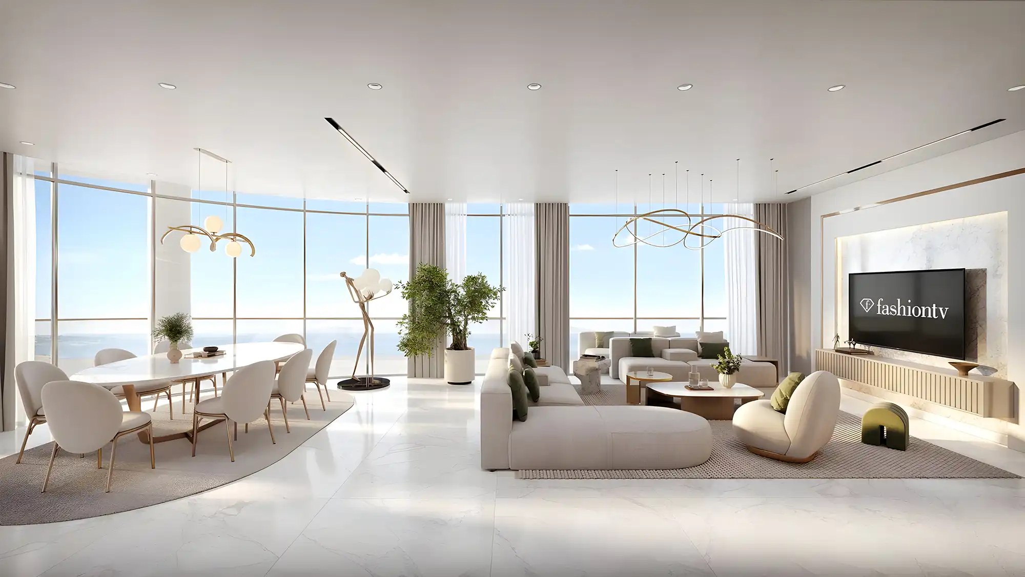 The project rises 2B + G + 12 floors + Roof and features 1 to 3-bedroom apartments and 4-bedroom penthouses with private pools. Interiors emphasize openness and flow, with light-filled living spaces, elegant materials, and expansive balconies overlooking the sea.