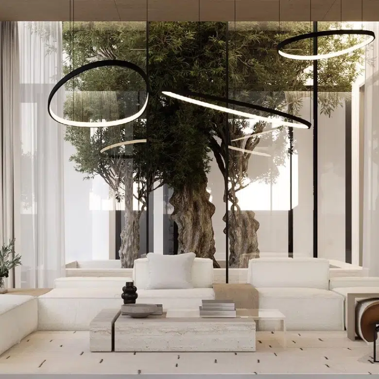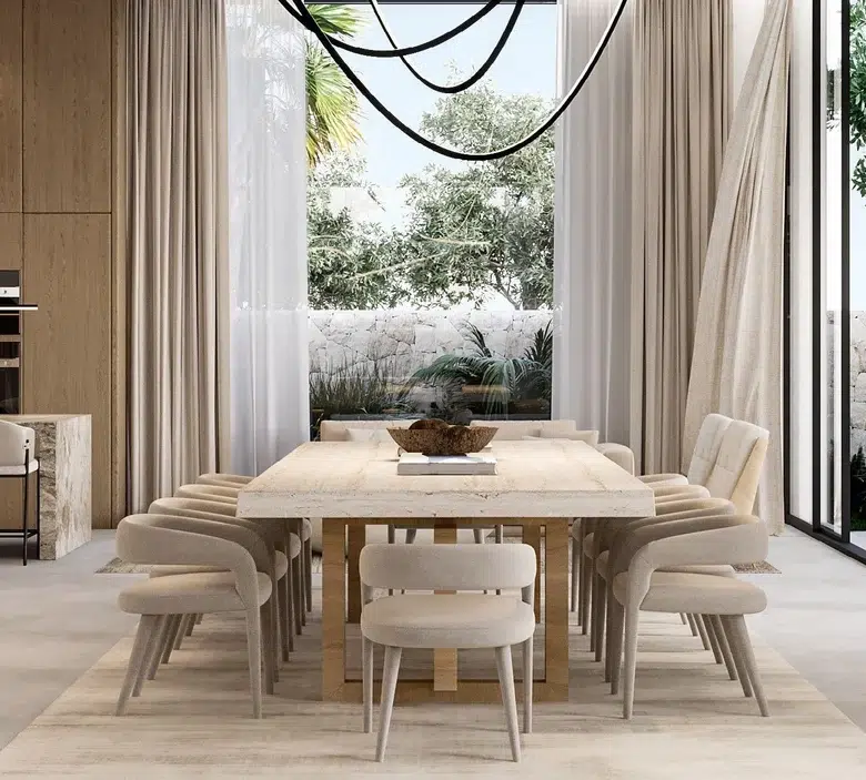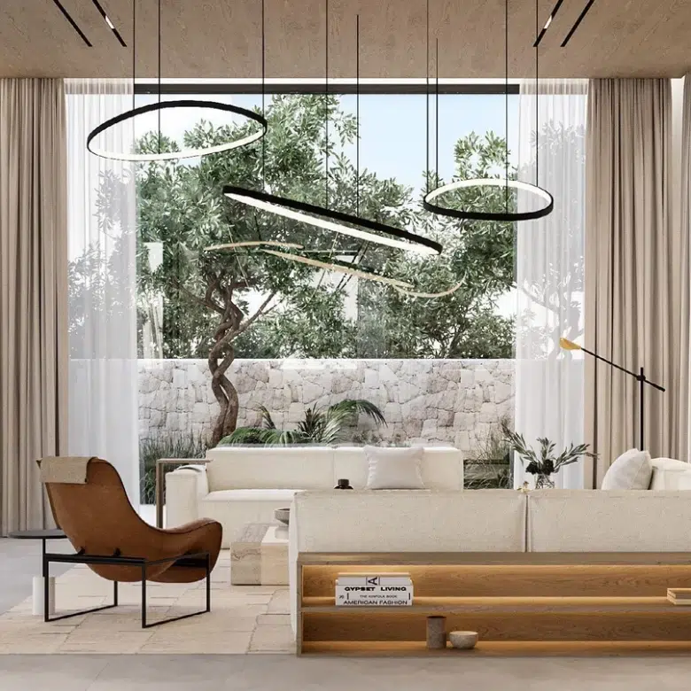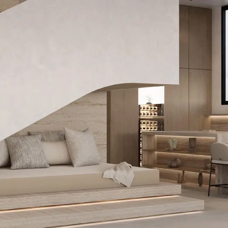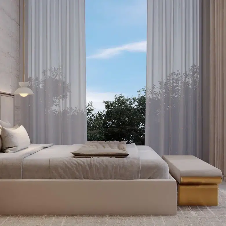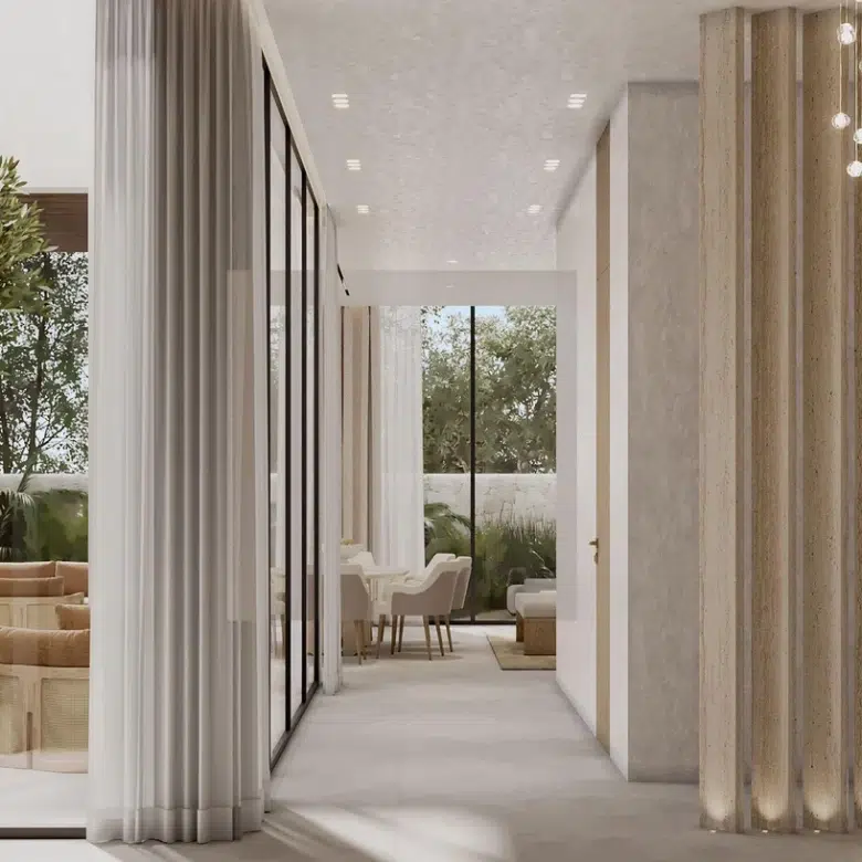 The architectural design of Al Naseem Villas draws inspiration from Mediterranean aesthetics — characterized by natural materials, minimalist lines, and bright, open spaces. Extensive use of travertine stone, brass screens, and large glass façades creates a distinctive interplay of light and texture. The homes are designed to blend seamlessly with Hudayriyat’s natural topography, creating a living environment that feels both grounded and elevated.
