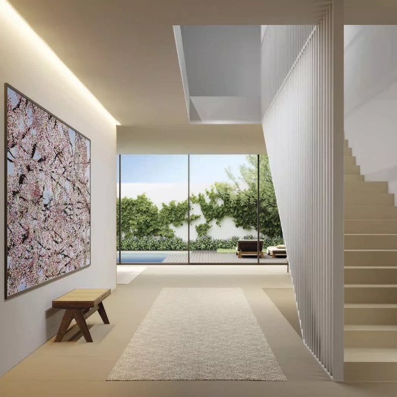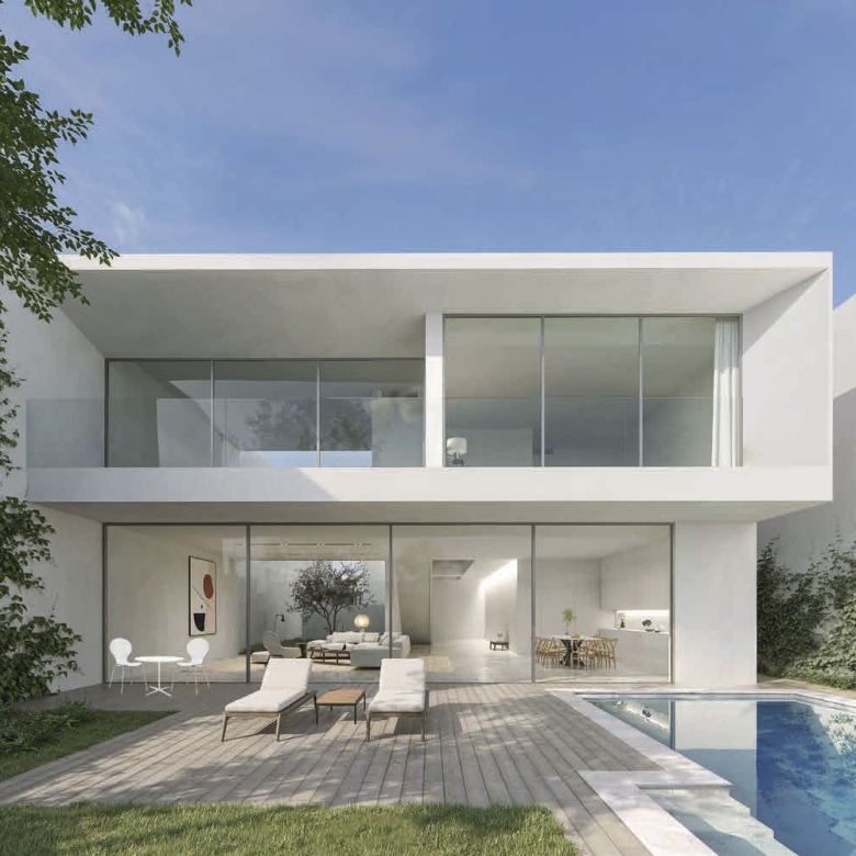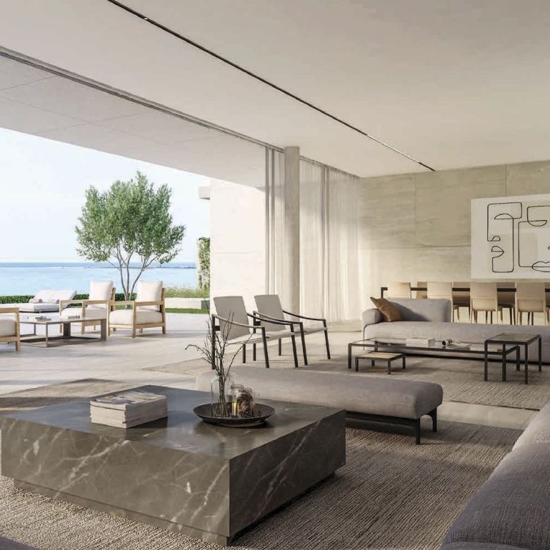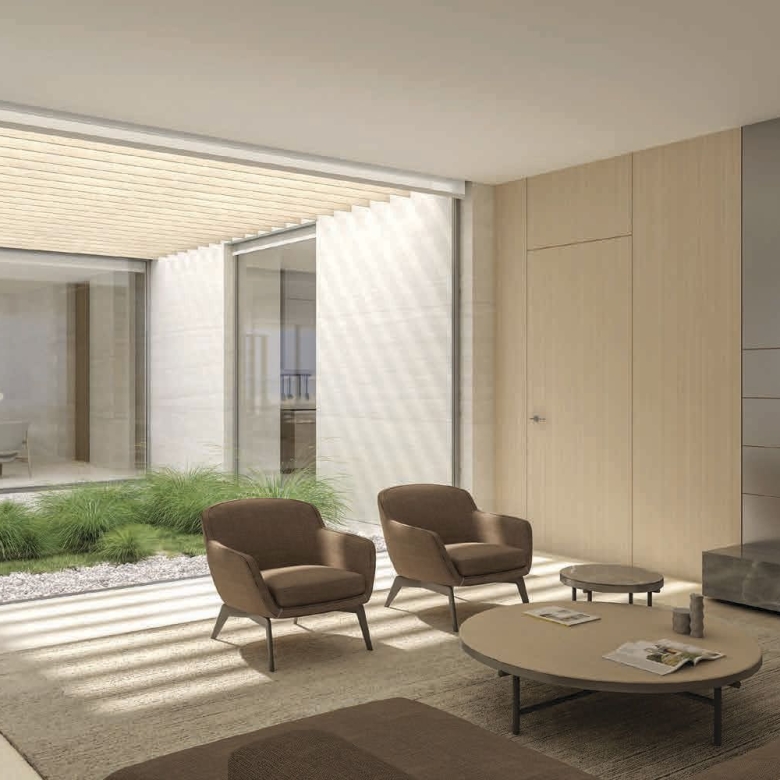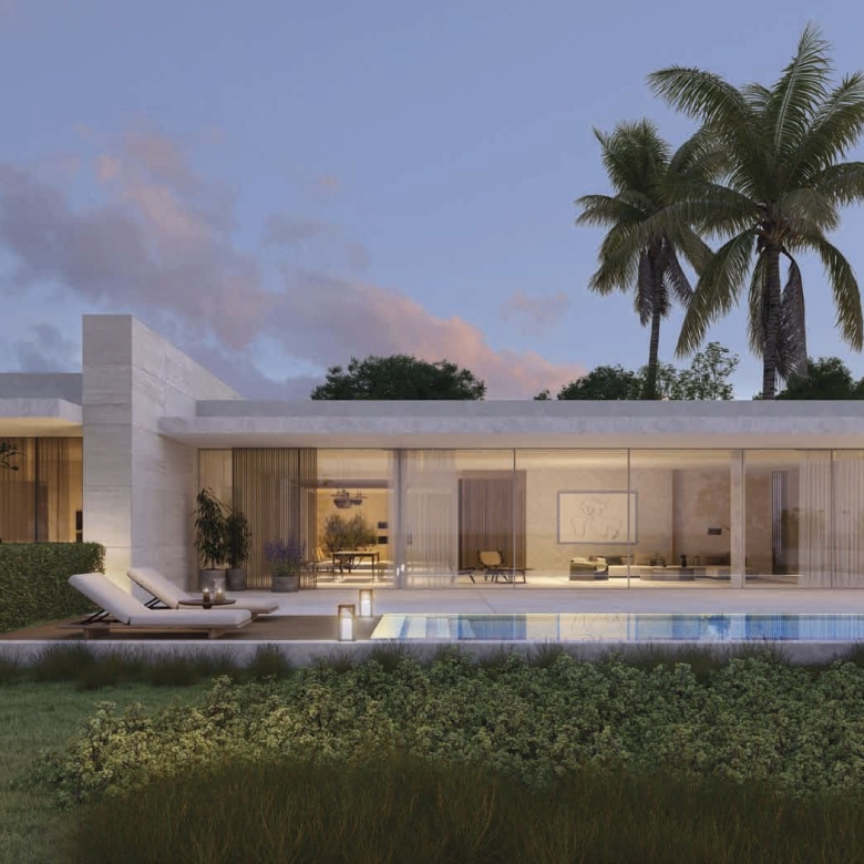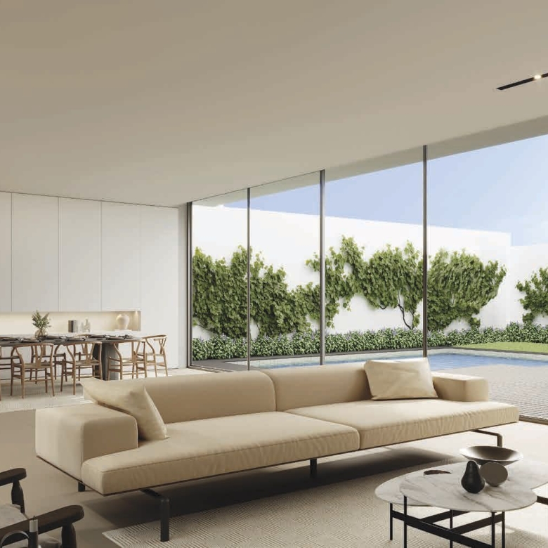 The villas feature a single-level design focused on functional elegance. Each 4-bedroom home includes expansive living areas, a family lounge, multiple terraces, and integrated dining spaces. Sliding glass walls connect interiors with private gardens and pools, creating a fluid transition between indoor and outdoor living.