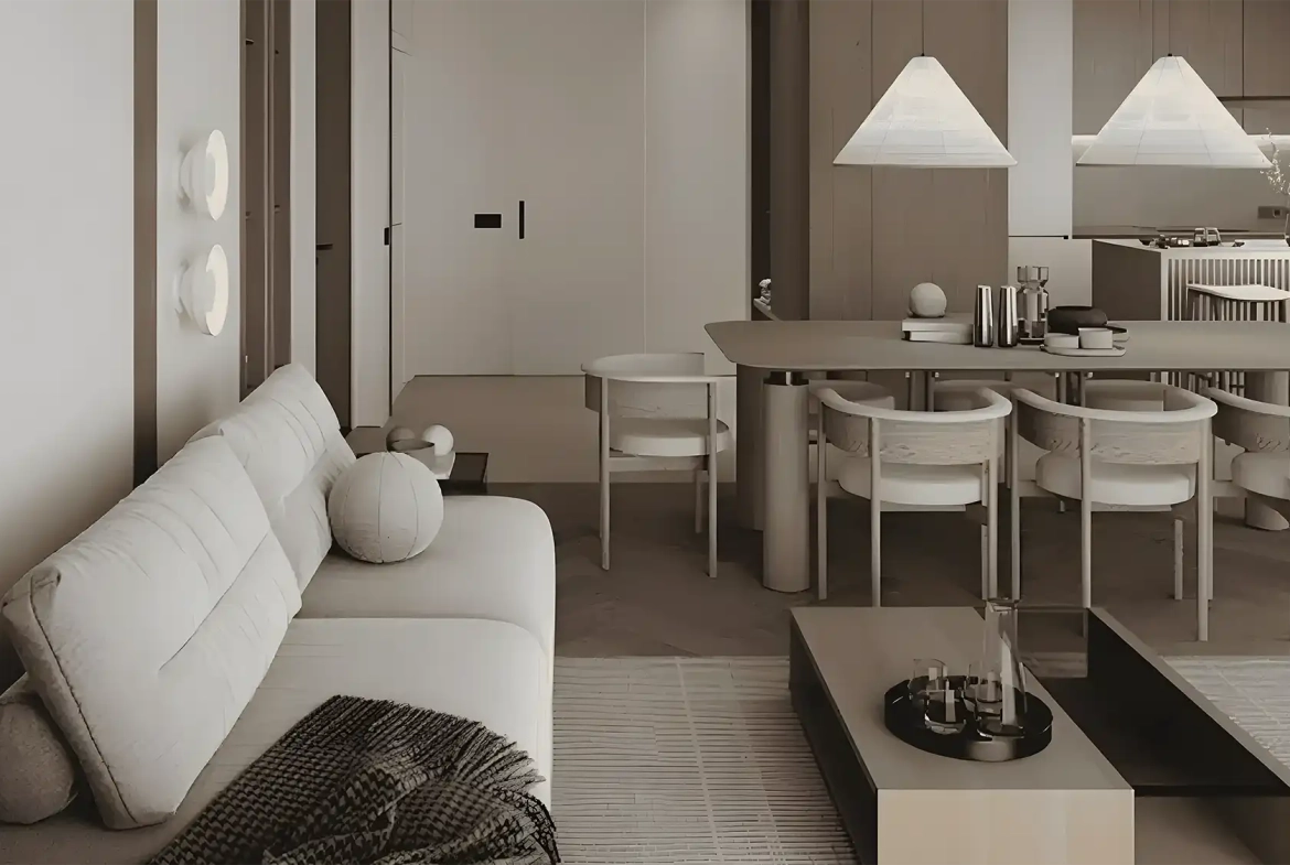 Apartments at Aura Prestige are designed with practicality and comfort in mind, featuring open-plan living and dining areas complemented by large panoramic windows. In addition, neutral interior tones, wood and stone textures, and high-quality materials create a bright and welcoming atmosphere.