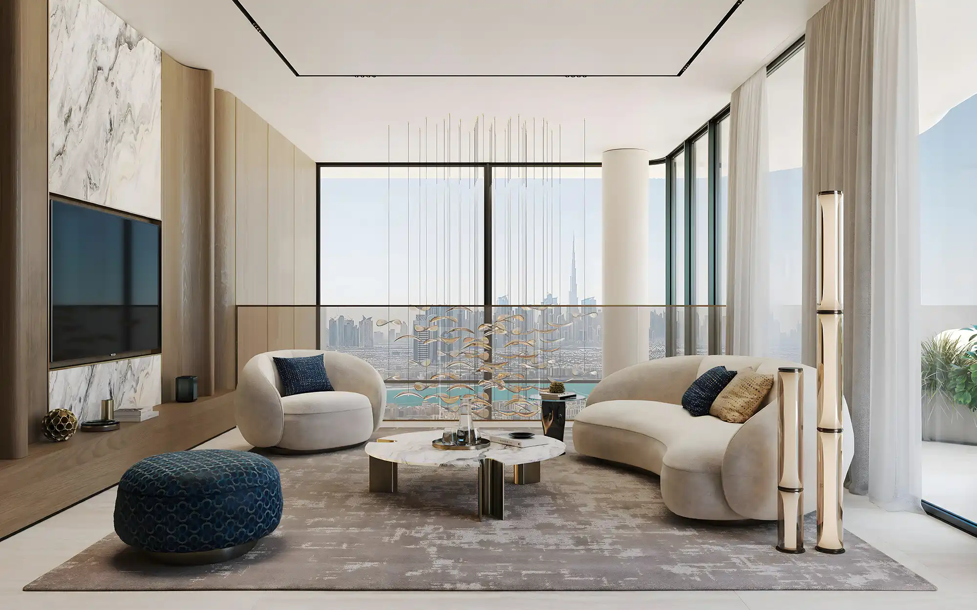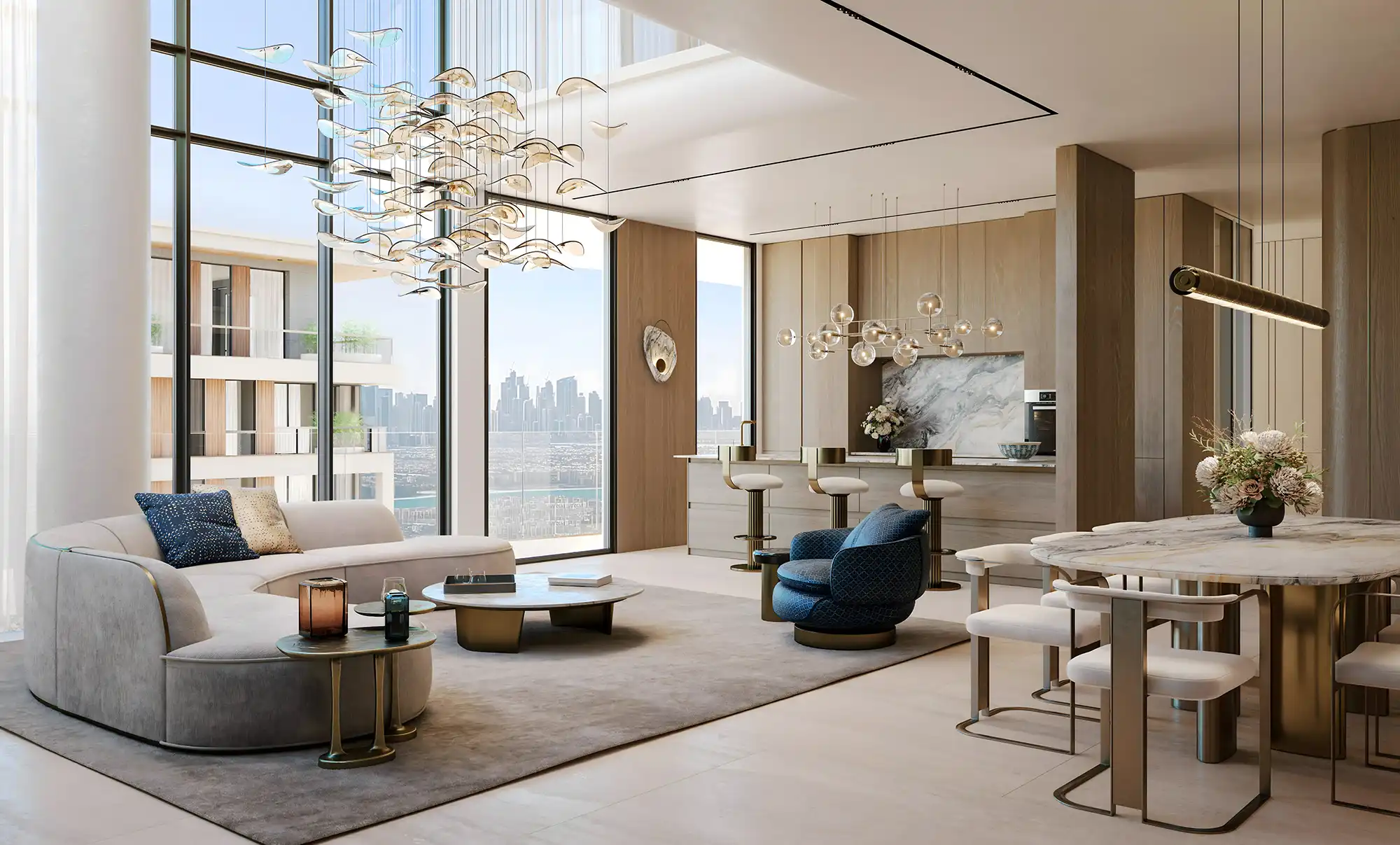 Apartments at CDS Wave are finished with a refined material palette including natural wood, textured wall coatings, marble accents, and nickel-plated detailing. In addition, bathrooms feature warm natural tones, while kitchens come fully equipped with fitted cabinetry and appliances.