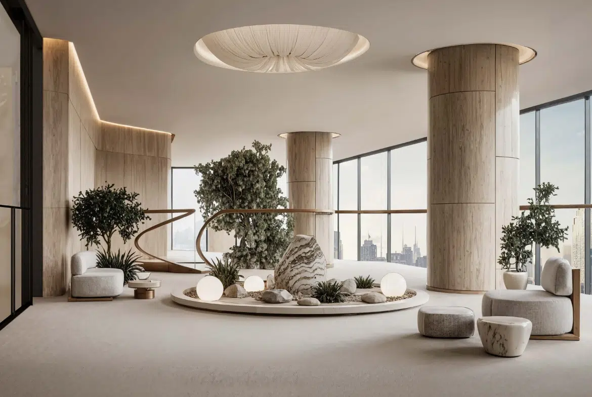 - Minimalist yet luxurious design blending marble, glass, and wood finishes