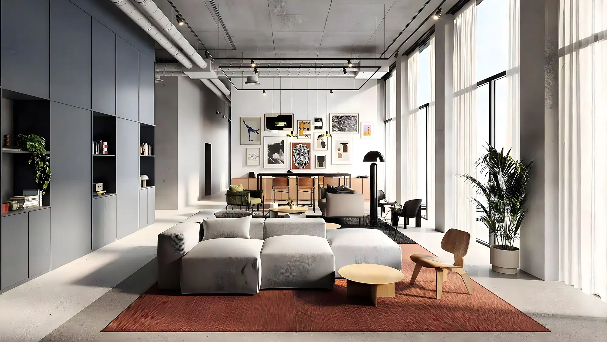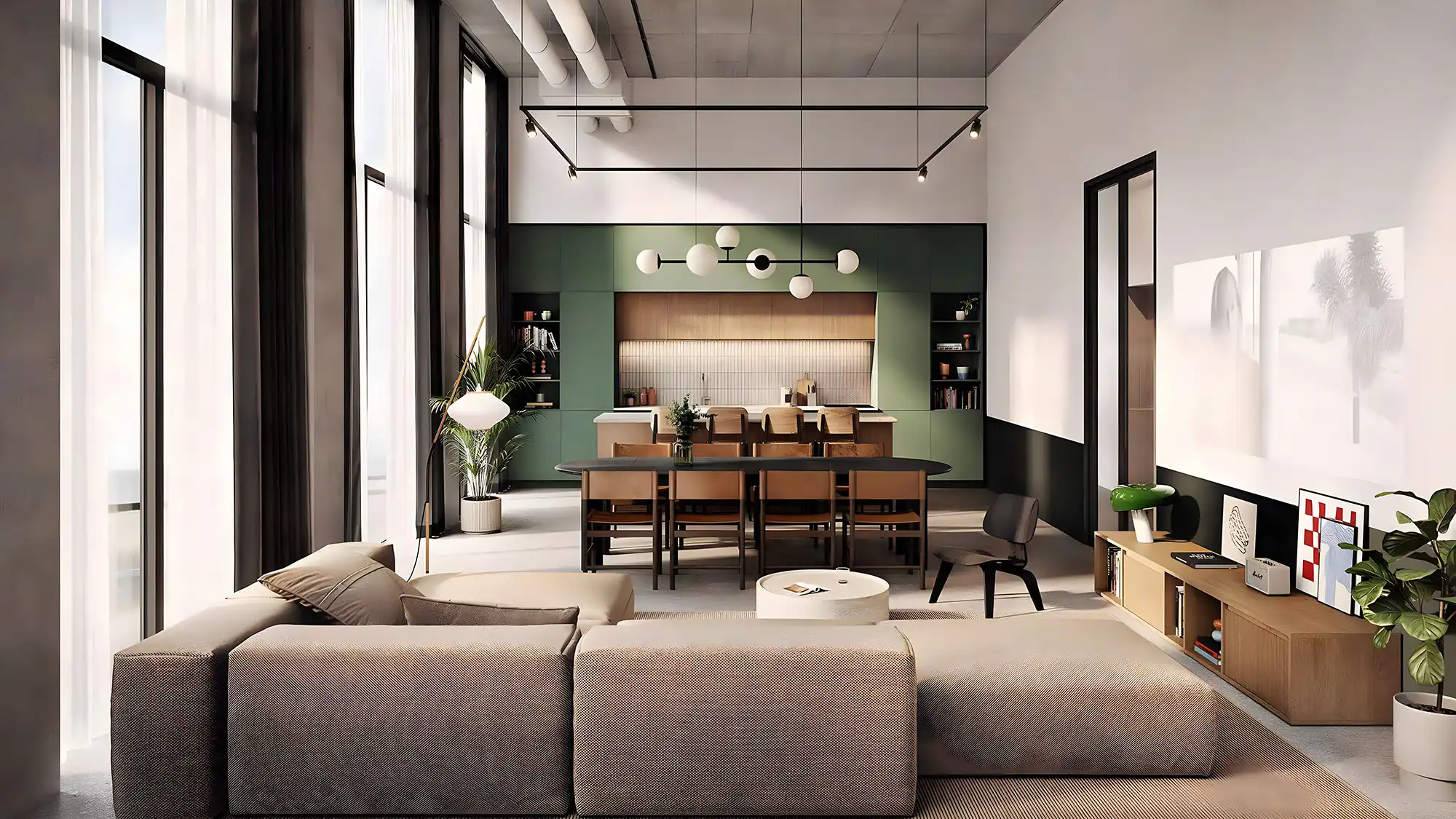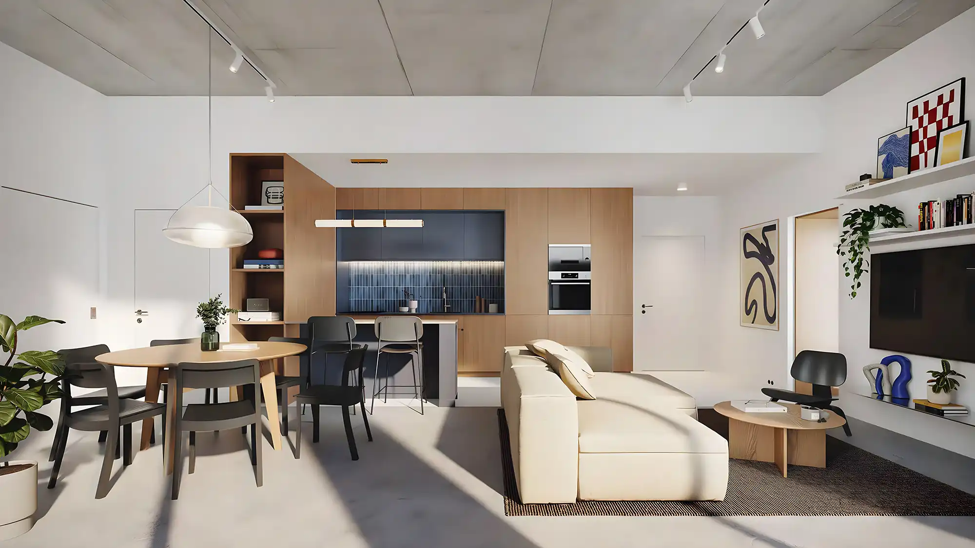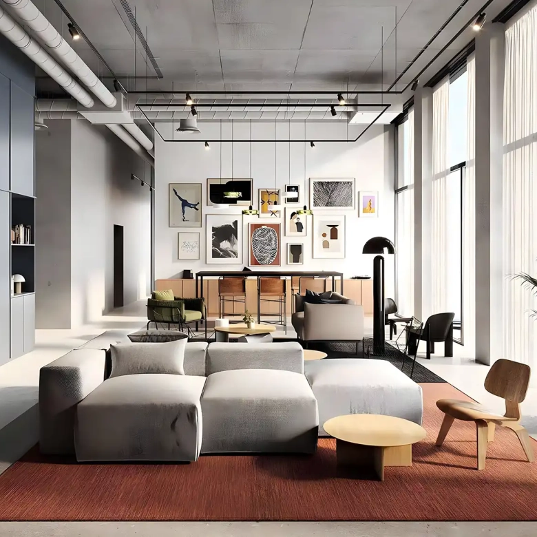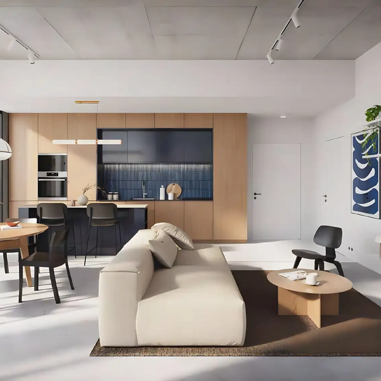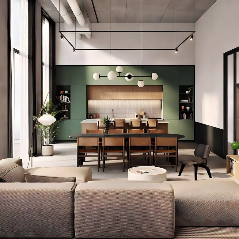 - Natural tones and open-plan interiors