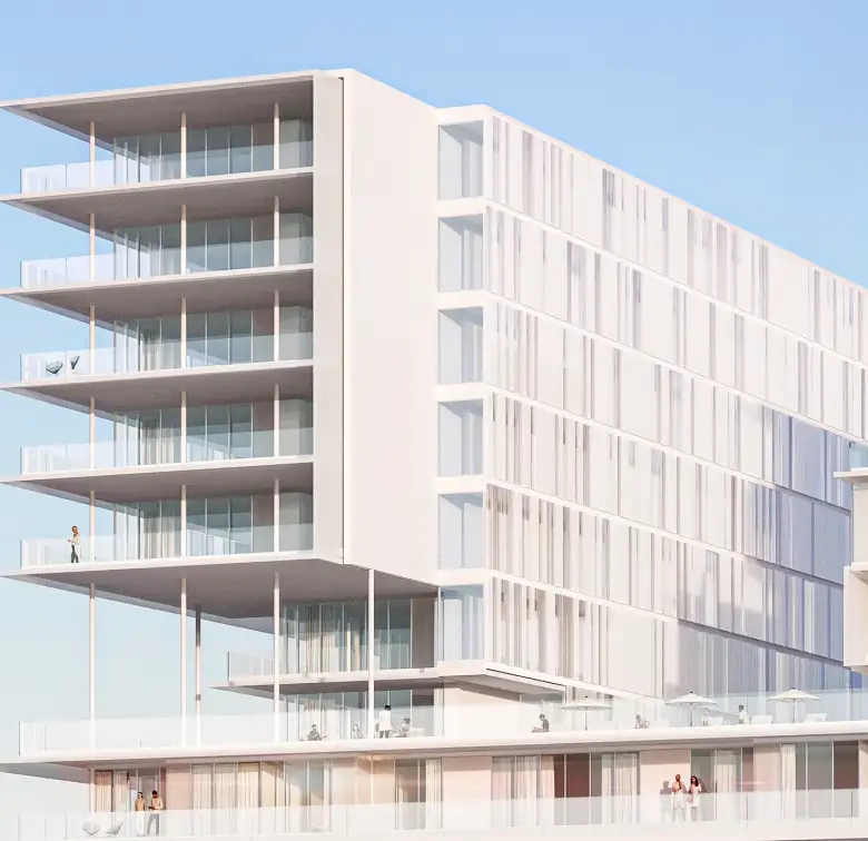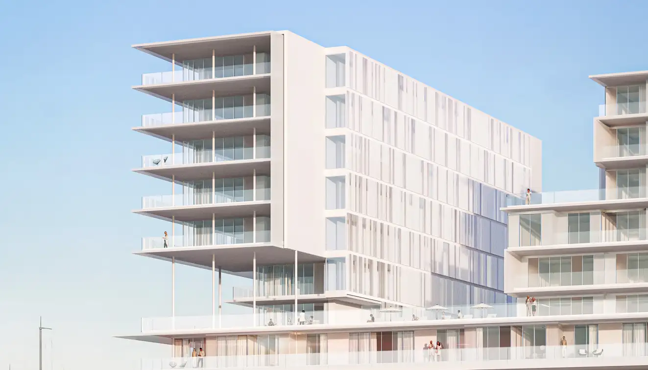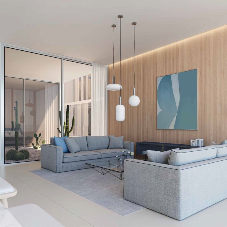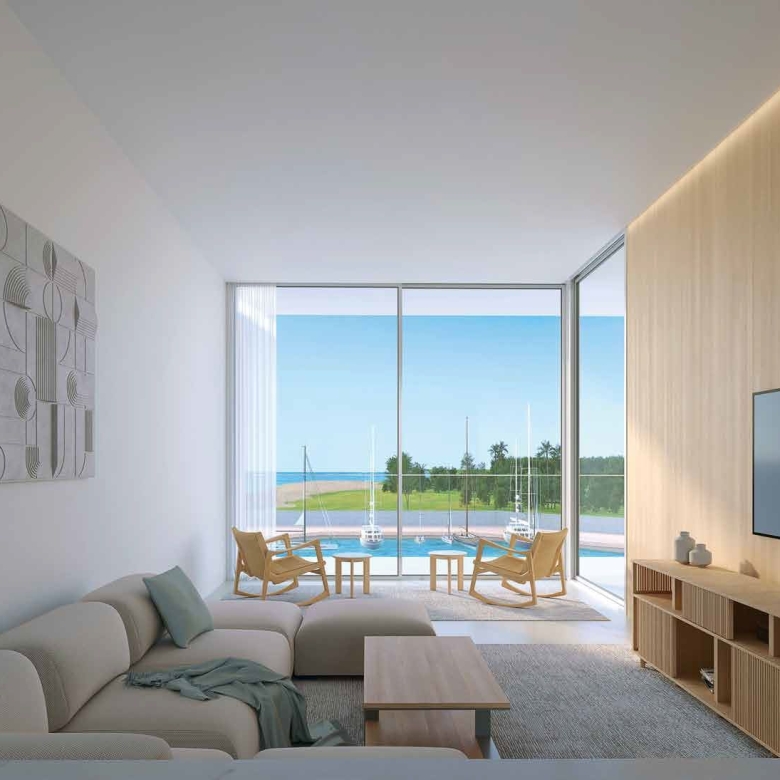 The project includes studio, 1, 2, and 3-bedroom apartments as well as 2 and 3-bedroom duplexes across G + 8 floors. Each home is designed with an open layout and carefully proportioned living areas to optimize comfort and natural light. Interior palettes emphasize calm tones and elegant materials to reflect the coastal setting.