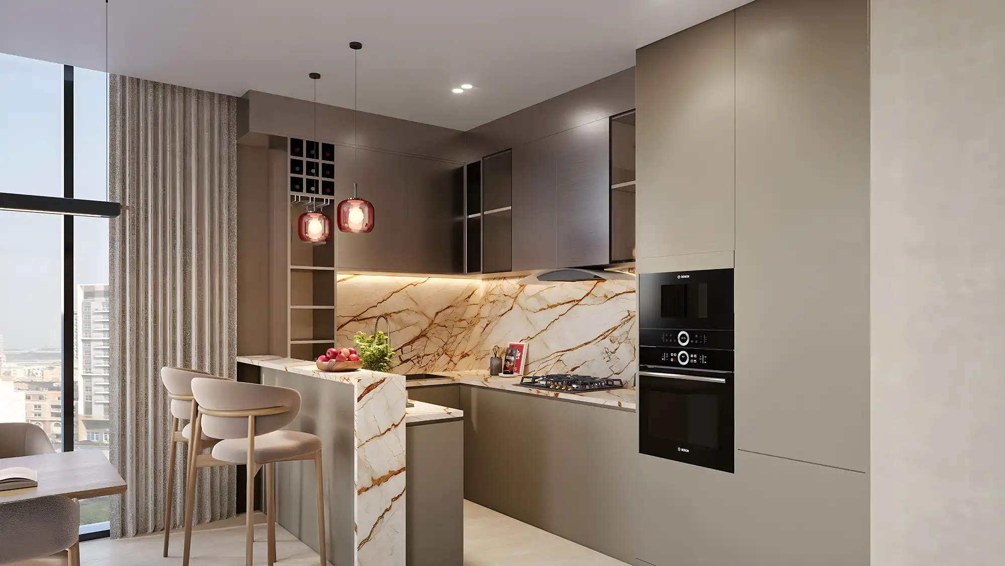 HOLM One at Jumeirah Garden City offers fully furnished studios and one-bedroom apartments. The project includes 218 units in total, with 162 studios and 56 one-bedroom units, each designed with efficient layouts, built-in kitchens with appliances, and practical storage solutions.