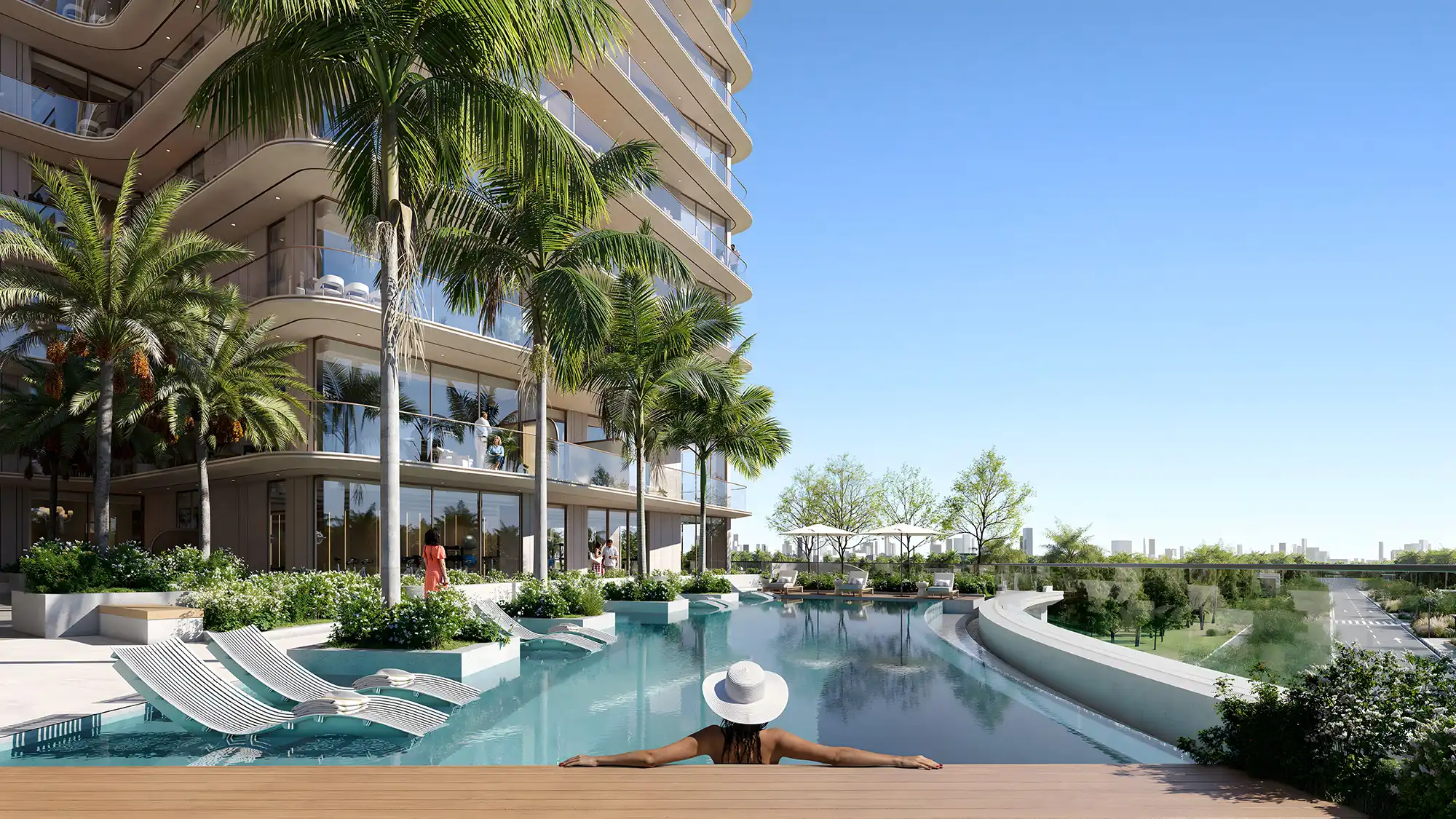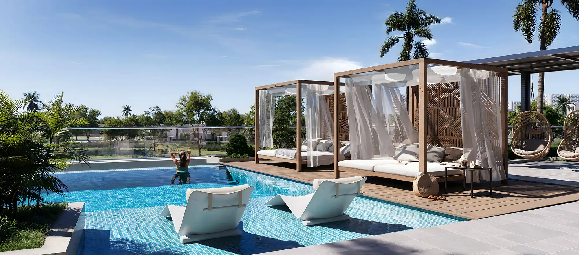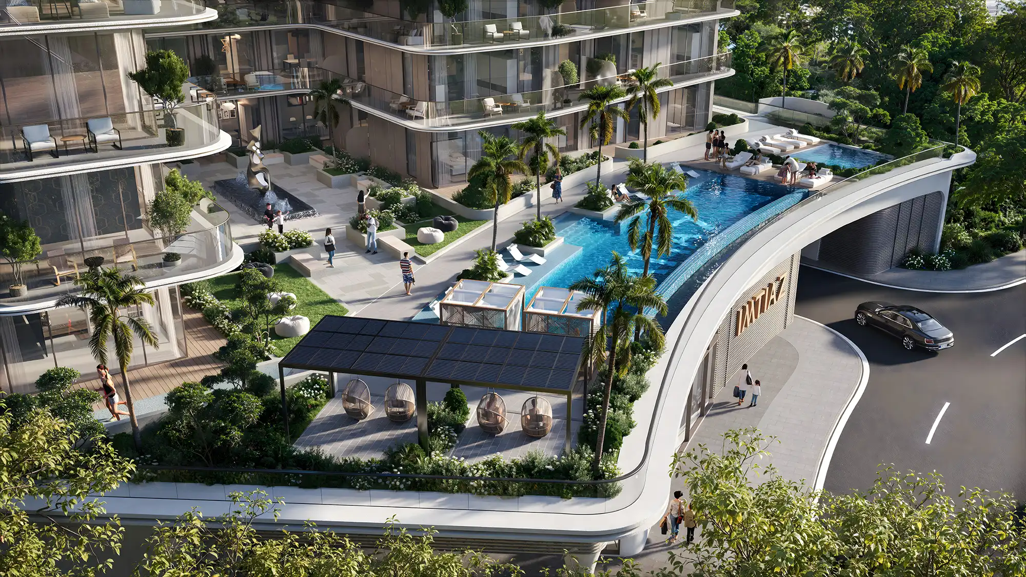Residents can enjoy an infinity pool, a poolside lounge area, and a separate children’s pool, while green landscaping and walking paths support an outdoor lifestyle. Furthermore, the project includes a clubhouse, a spacious lobby, a landscaped courtyard, and an open-air cinema on the roof.