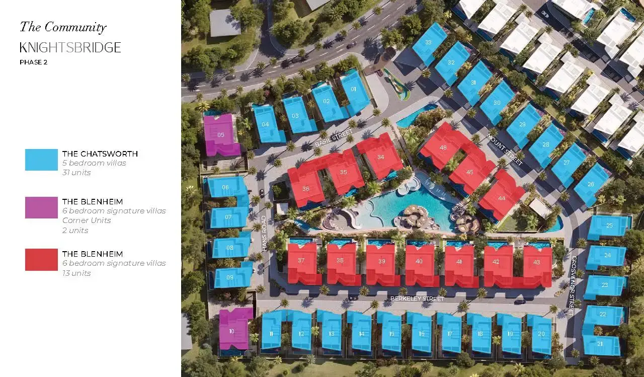 A2: The project includes 5-bedroom villas (The Chatsworth) and 6-bedroom signature villas (The Blenheim).