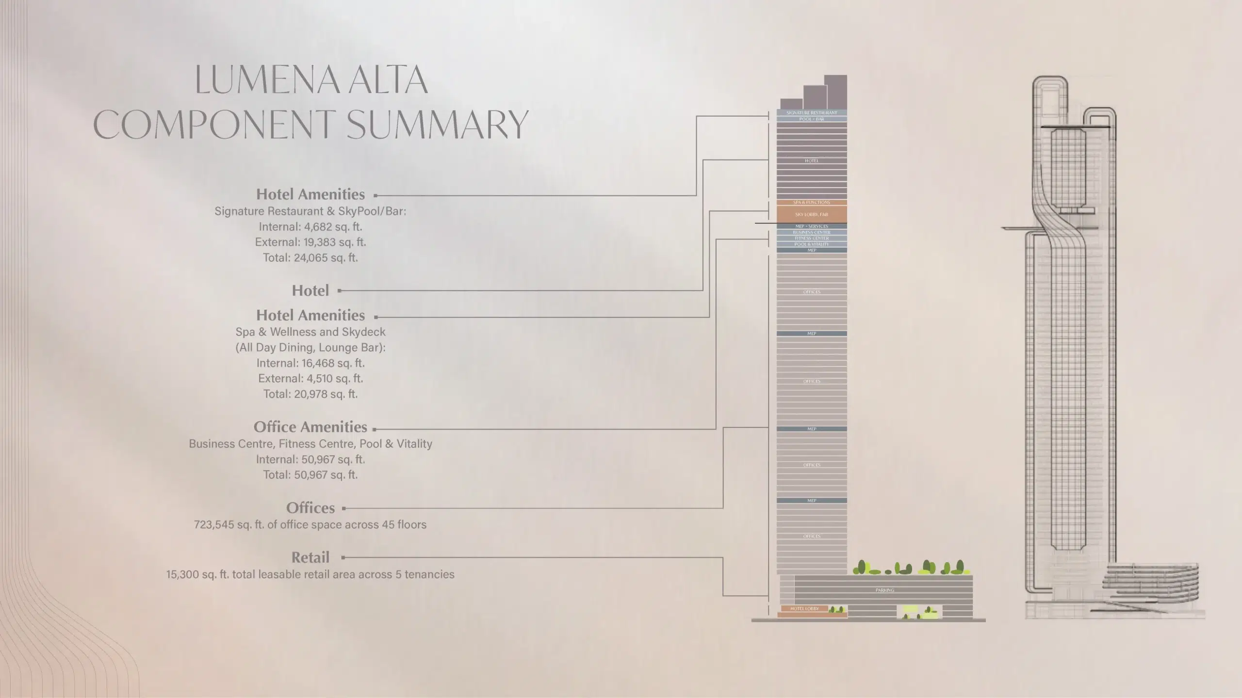 Lumena Alta by OMNIYAT is a 380-metre, Grade-A mixed-use commercial landmark at the gateway to Business Bay, offering premium shell-and-core offices integrated with hospitality-grade amenities and a five-star sky hotel.