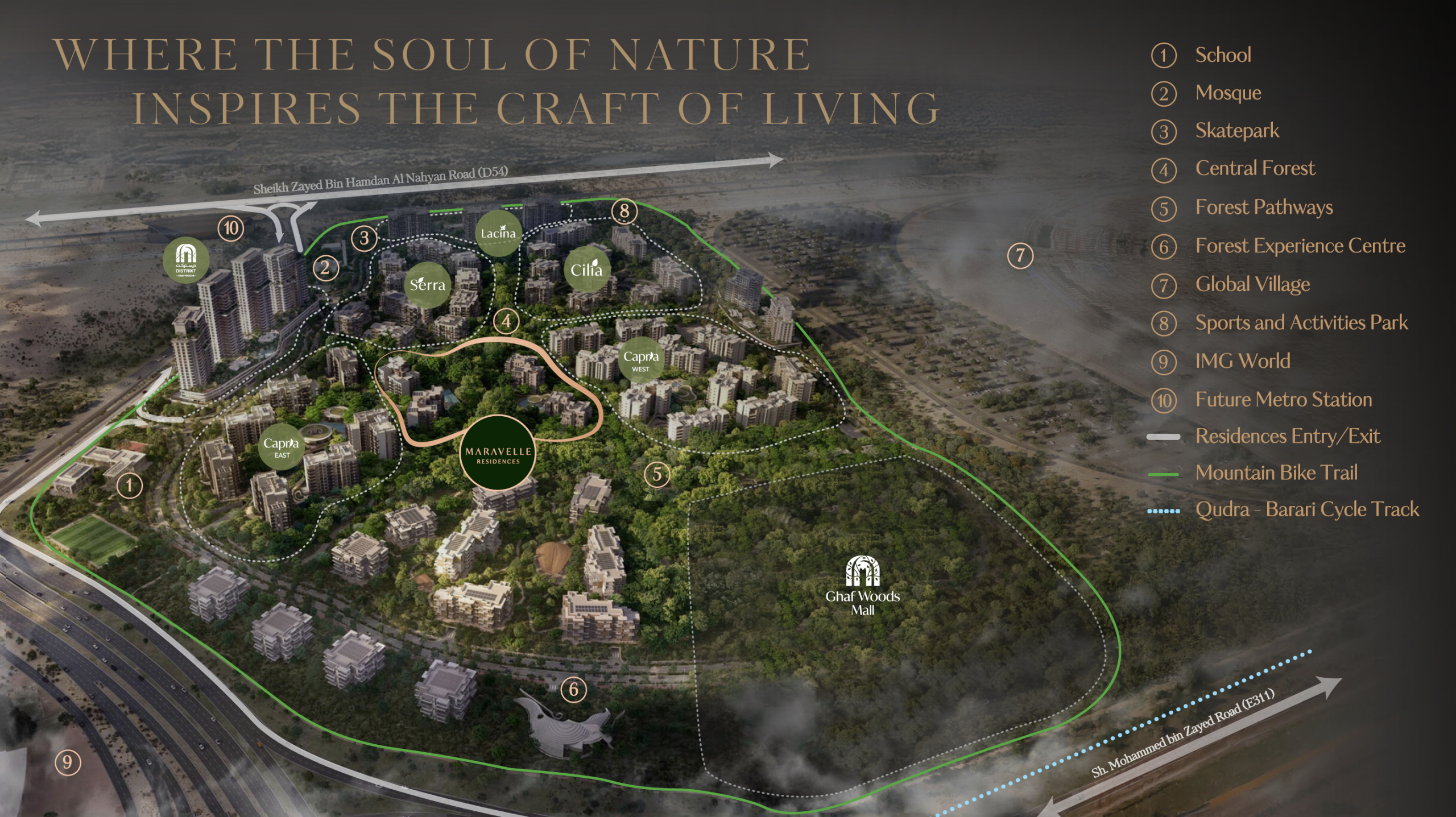 Maravelle is located in Ghaf Woods, Dubai’s first forest community offering sustainable and wellness-oriented living. The location provides fast connectivity to major landmarks: Downtown Dubai, Dubai Marina, and Palm Jumeirah (25 min), DXB and Al Maktoum International Airports (20 min), and Mall of the Emirates (20 min). Additionally, nearby destinations include Global Village, Dubai Hills Mall, IMG Worlds of Adventure, and Dubai Miracle Garden — all within a short drive.