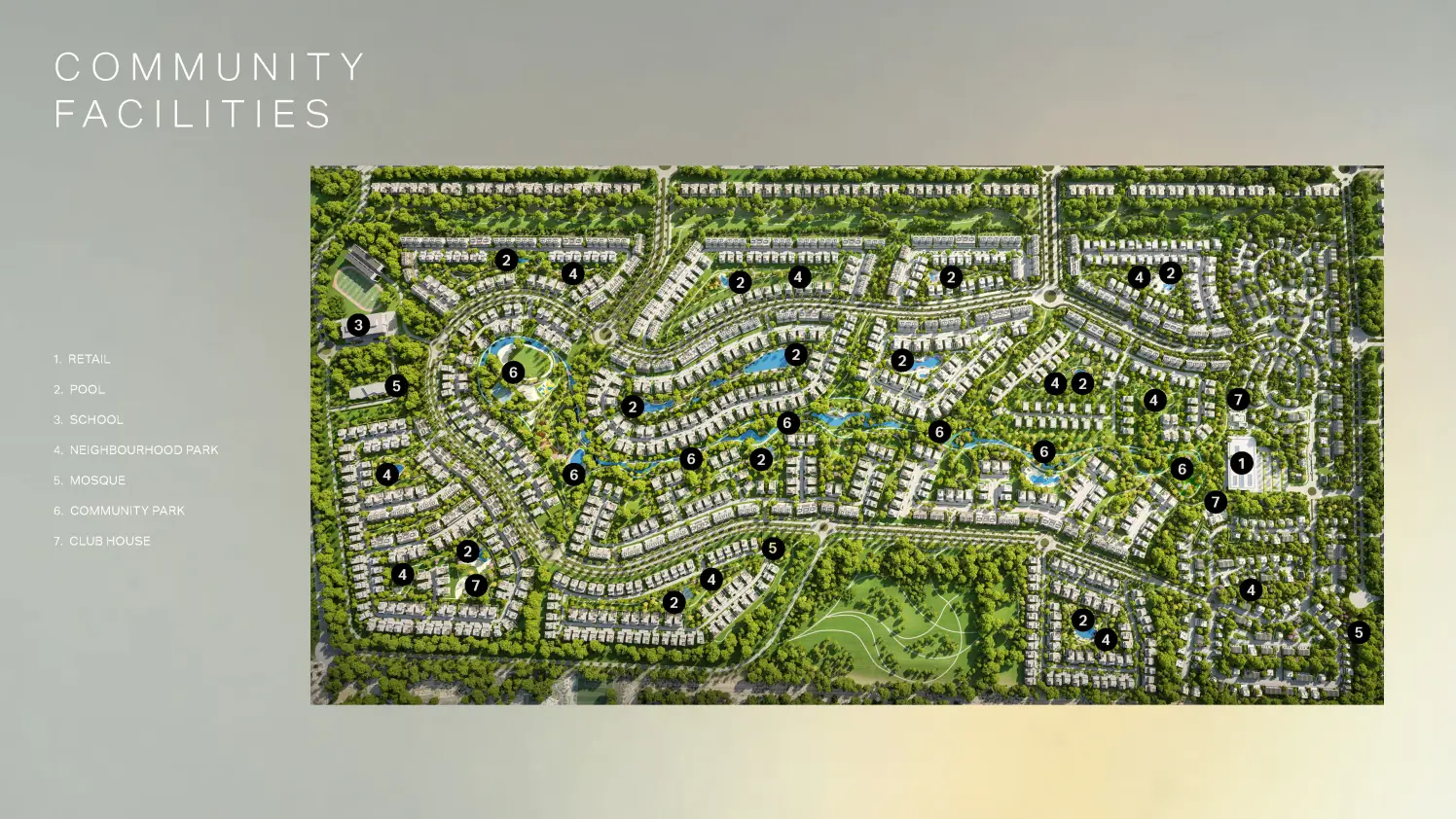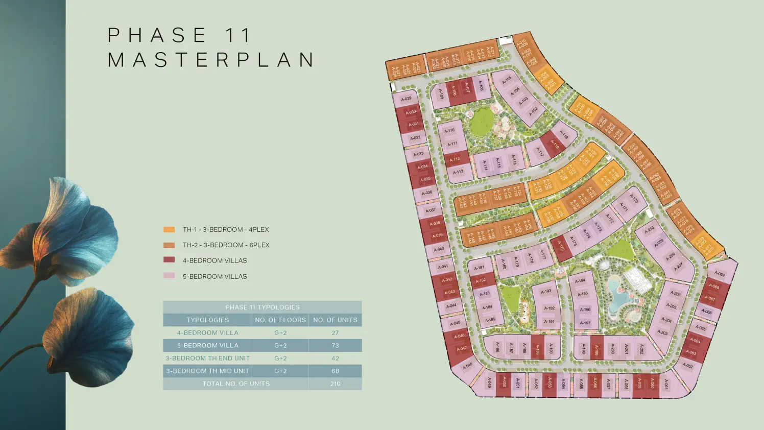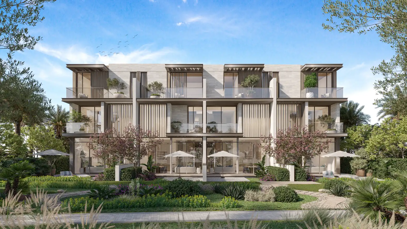 - Spacious three-bedroom townhouses and four and five-bedroom villas with modern floor plans.