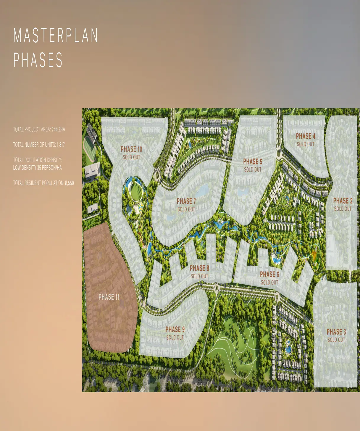 The Nad Al Sheba Gardens masterplan outlines a total project area of approximately 244.2 hectares with around 1,817 units and a planned resident population of about 8,550 people, translating into a low density of roughly 35 persons per hectare. Notably, phases two through ten of the community are already sold out, which strongly suggests sustained buyer demand and growing confidence in both the location and the product.