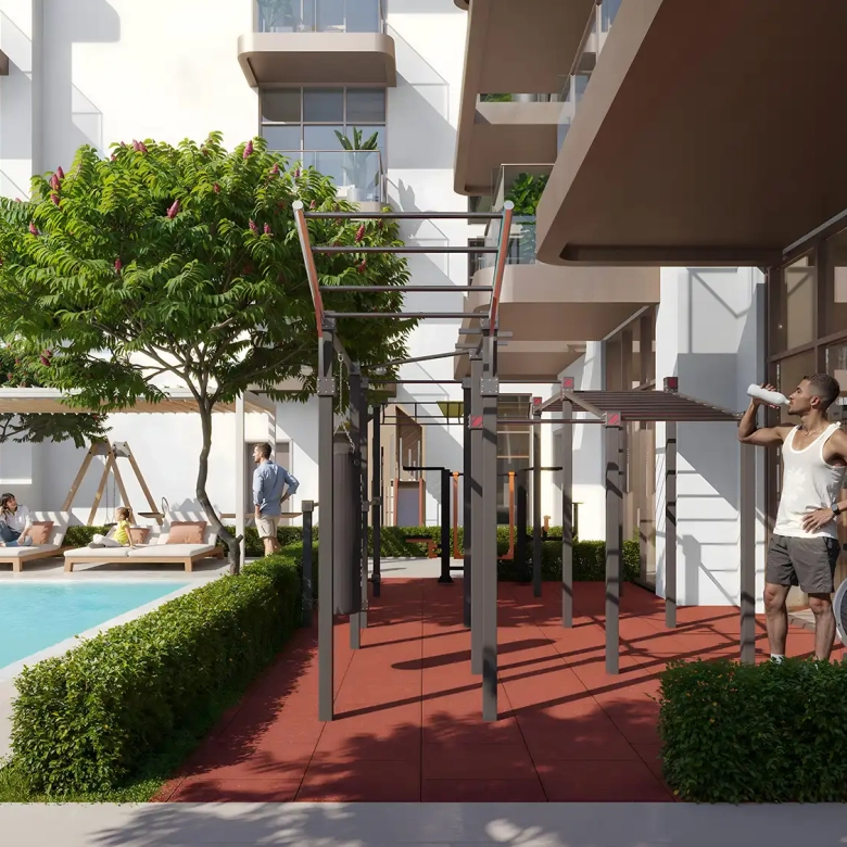 The project offers a swimming pool, kids’ pool, gym, outdoor CrossFit area, clubhouse, and landscaped play zones for families.