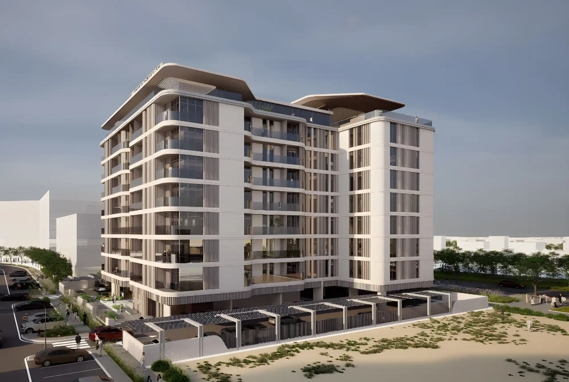 It is a mid-rise residential project in Dubai South featuring 77 apartments with 1, 2, and 3-bedroom layouts, rooftop amenities, and a Q3 2027 handover.